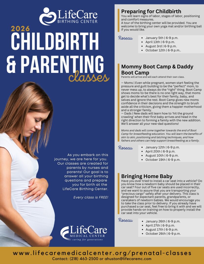 Take advantage of a FREE, 1-1 Early Pregnancy Education session with a Public Health Nurse. Open to all pregnant mothers, ideally in the first trimester. We’ll answer your questions and you will learn best practices in how to have a healthy pregnancy. This is a complimentary service LifeCare offers all area moms. Contact LifeCare Medical Center Public Health at 463-3211, Ext. 4171 to schedule your session.